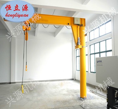 懸臂吊起重機工作強度為輕型,起重機由立柱,回轉臂回轉驅動裝置及電動葫蘆組成,立柱下端通過地腳螺栓固定在混凝土基礎上,由擺線針輪減速裝置來驅動懸臂回轉,電動葫蘆在懸臂工字鋼上作左右直線運行,并起吊重物。起重機旋臂為空心型鋼結構,自重輕,跨度大,起重量大,經濟耐用。內置式行走機構,采用帶滾動軸承的特種工程塑料走輪,摩擦力小,行走輕快;結構尺寸小,特別有利于提高吊鉤行程。